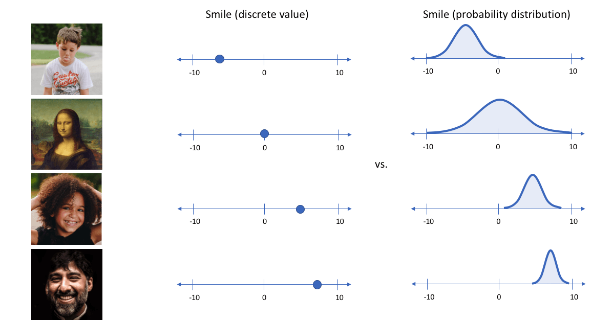 在上面的示例中,我们使用单个值来描述输入图像在潜在特征上的表现。但在实际情况中,我们可能更多时候倾向于将每个潜在特征表示为可能值的范围。例如,如果输入蒙娜丽莎的照片,将微笑特征设定为特定的单值(相当于断定蒙娜丽莎笑了或者没笑)显然不如将微笑特征设定为某个取值范围(例如将微笑特征设定为x到y范围内的某个数,这个范围内既有数值可以表示蒙娜丽莎笑了又有数值可以表示蒙娜丽莎没笑)更合适。而变分自编码器便是用“取值的概率分布”代替原先的单值来描述对特征的观察的模型,如下图的右边部分所示,经过变分自编码器的编码,每张图片的微笑特征不再是自编码器中的单值而是一个概率分布。