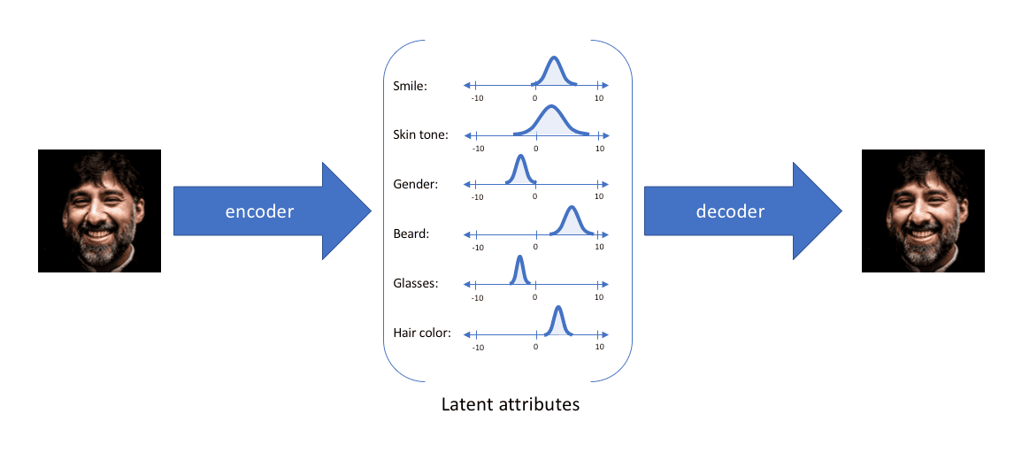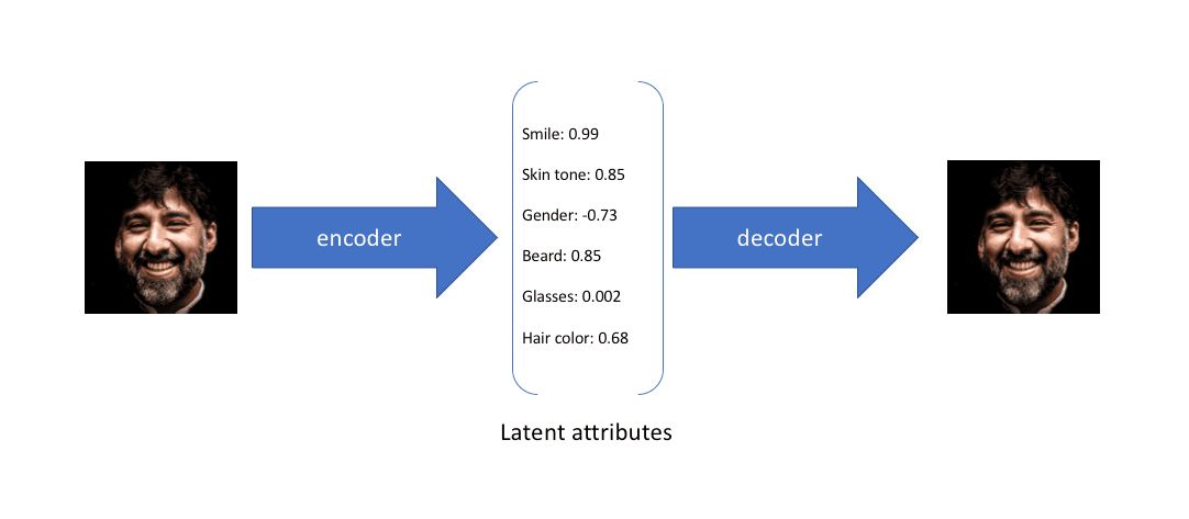 假设任何人像图片都可以由表情、肤色、性别、发型等几个特征的取值来唯一确定,那么我们将一张人像图片输入自动编码器后将会得到这张图片在表情、肤色等特征上的取值的向量X’,而后解码器将会根据这些特征的取值重构出原始输入的这张人像图片。